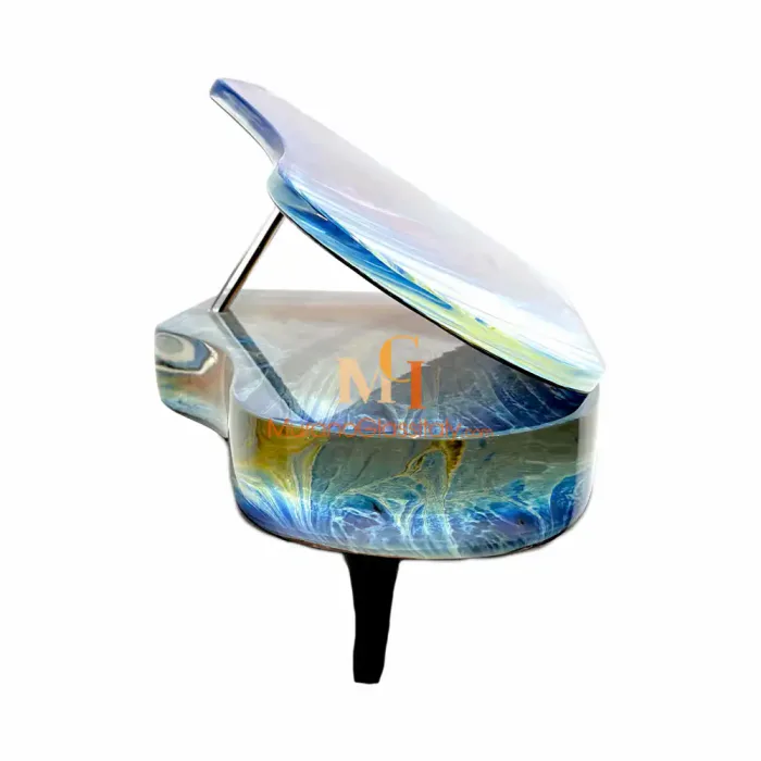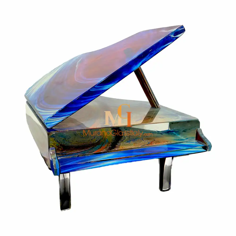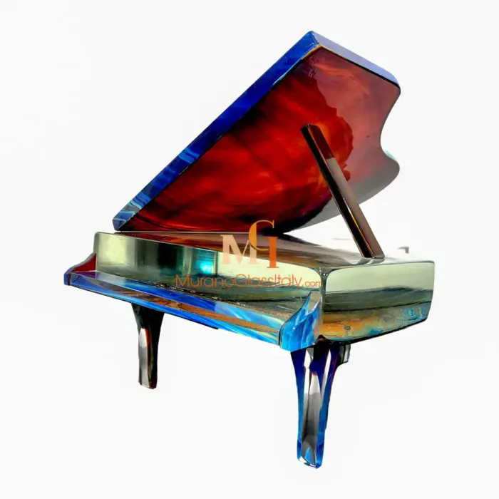 صُمم هذا البيانو الزجاجي المنفوخ لجميع عشاق الموسيقى، وهو قطعة فريدة ومميزة لهواة جمع التحف الفنية. صُنعت هذه القطعة الفنية يدوياً داخل أفران البندقية، وهي تحفة فنية من الفن الحديث. وكما يُصدر البيانو أصواتاً ونغمات مختلفة، كذلك يتميز هذا العمل الفني بقوس قزح من الألوان المختلفة. ويتحقق هذا التأثير من خلال تقنية خاصة جداً. مثل الخيميائي، يمزج فناننا بين السيليكا والمعادن الثمينة التي تخلق مزيجاً فريداً من الظلال. والنتيجة هي قطعة مذهلة بظلال ملونة تتراوح بين الأخضر والأزرق والأرجواني والبني. وأينما وضعت هذه المنحوتة فإنها تجمع بين الموسيقى والفن، مما يضفي ألواناً مبهجة ومتناغمة على الغرفة. مثل جميع القطع الزجاجية من زجاج مورانو، تعتبر هذه المنحوتة جوهرة فنية تزداد قيمتها بمرور الوقت. يبلغ طول البيانو 45 سم وارتفاعه 25 سم. علاوة على ذلك، نظرًا لأننا نصنع جميع أعمالنا يدويًا بنسبة 100٪، عند الطلب، فمن الممكن أيضًا تخصيص البيانو الزجاجي المنفوخ من حيث الحجم. إذا كان لديك أي أسئلة، يُرجى عدم التردد في الاتصال بنا. اكتب لنا بريدًا إلكترونيًا على customer@muranoglassitaly.com. يسعد خبراؤنا بتقديم الدعم لك.