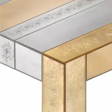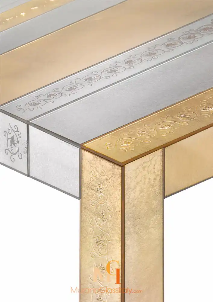 طاولة طعام زجاجية من فينيسيا مزخرفة بشرائط من المرآة العتيقة وزجاج متعدد الألوان مع نقوش زهور مصنوعة يدويًا.