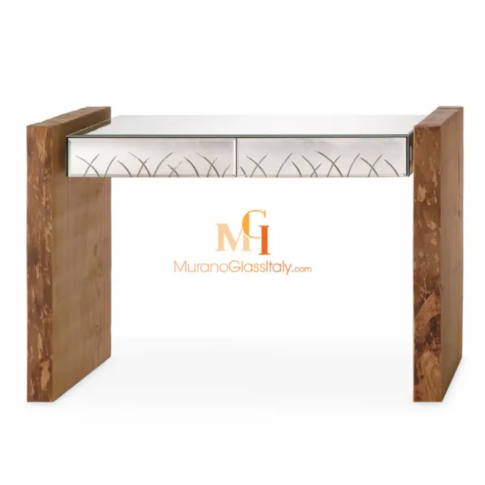 كونسول خشب طبيعي من البلوط والزجاج مع درجين، مصنوعة من مرآة معتقة وتتميز بنقوش يدوية لامعة. الهيكل والجوانب مصنوعة من البلوط الصلب، مما يضيف لها الصلابة والجمال. تلك الطاولة تجمع بين تصميم عصري وتفاصيل فنية تعكس الحرفية العالية في الصناعة.