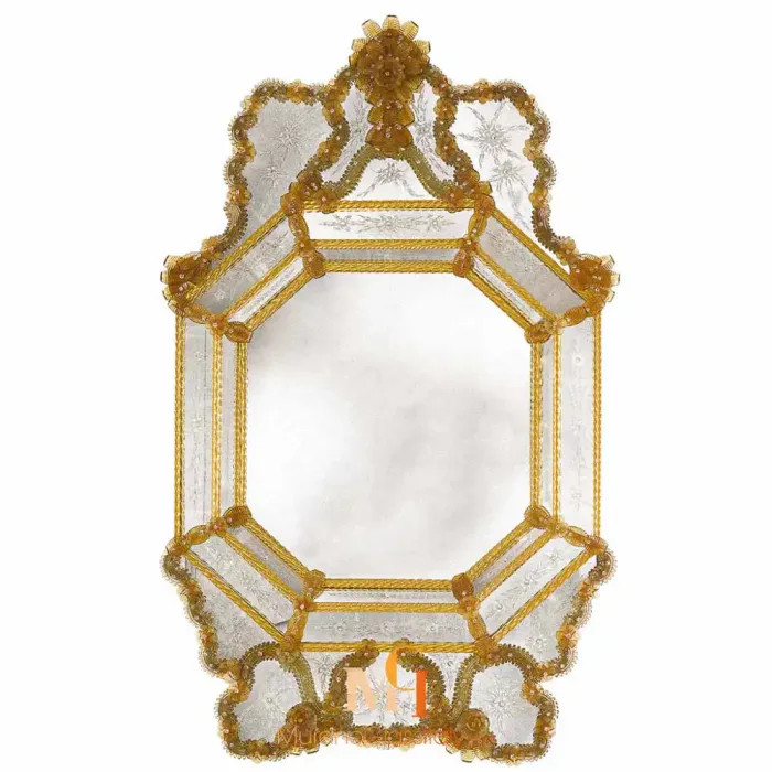 مرايات حائط ديكور فينيسية بنقوش مصنوعة يدويًا وزخارف من زجاج مورانو مع زهور وأوراق من الزجاج الكريستالي العنبري.