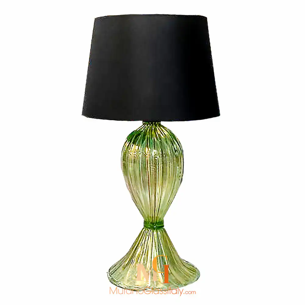 Italienische Tischleuchten bringen einen einzigartigen Glanz in Ihr Zuhause. 100%ige italienische Handwerkskunst vereint mit dem Luxus von 24 Karat Gold direkt aus Murano, Italien. Diese Tischlampe ist ein zeitloser Klassiker, der zu einem modernen wie auch klassischen Ambiente passt. Die mundgeblasene Kristallglas Basis wurde mit 24 Karat Gold veredelt, dadurch wird diese formschöne Tischlampe aus grünem Glas zu einem besonderen Blickfang. Die verfügbaren Lampenschirmfarben sind weiß, creme und schwarz. Bitte beachten Sie, dass diese Lampen wegen der handwerklichen Ausführung leicht in der Höhe variieren, für weitere Informationen kontaktieren Sie uns unter customer@muranoglassitaly.com.