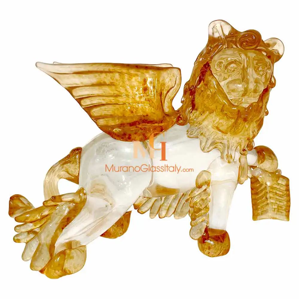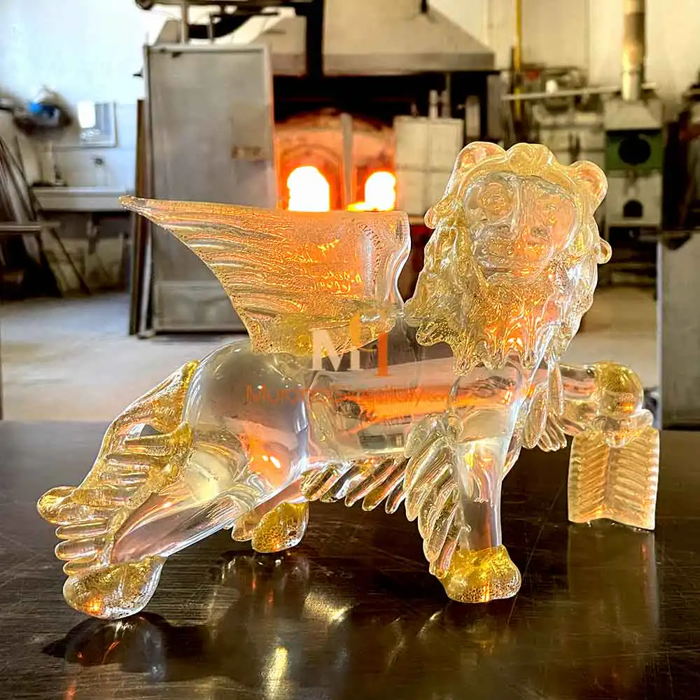 Die wunderschöne Murano-Glas-Löwe-Skulptur – Leone di San Marco verleiht Ihrem Zuhause oder Büro einen Hauch von venezianischem Charme. Geschickte Handwerker auf der Insel Murano, Italien, haben diese atemberaubende Skulptur mit der alten Technik des Glasblasens und Modellierens gefertigt. Sie haben klares Glas mit 24-karätigem Gold durchsetzt, was einen schillernden Effekt erzeugt, der das Licht reflektiert und die Schönheit der Löwenmerkmale hervorhebt. Der Löwe symbolisiert Venedig, die Stadt der Kunst und Kultur, und diese Skulptur zollt ihrer Geschichte und Tradition Tribut. Darüber hinaus steht der Löwe für Stärke, Mut und Adel, was dieses Kunstwerk zu einem perfekten Geschenk für jemanden Besonderen macht.