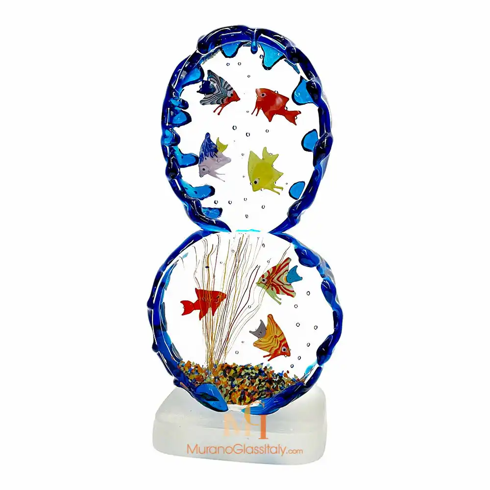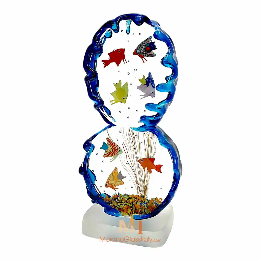 Lassen Sie sich von der Schönheit unserer Murano Glasfische verzaubern und schmücken Sie Ihr Zuhause mit einer prächtigen Meeresskulptur. Dieses Aquarium ist mehr als nur ein Möbelstück, es ist ein atemberaubendes Meisterwerk, das Freude und Glück hervorruft. Die Skulptur wird in der wunderschönen Lagune von Venedig handgefertigt, wo die Künstler das Glas mit traditionellen Glasblastechniken formen. Die gekonnte Ausführung der Arbeit zeigt die Fähigkeit des Künstlers, ein atemberaubendes Kunstwerk zu schaffen. Die Skulptur ist eine elegante Darstellung des Unterwasserreichs mit bunten Fischen, die anmutig in verschiedene Richtungen schwimmen und ein Gefühl von Bewegung und Lebendigkeit hervorrufen. Während Sie das Aquarium beobachten, werden Sie in eine Unterwasserwelt versetzt. Die Schönheit und Vielfalt der Fische, jeder einzigartig und anders, erinnert uns an den Reichtum und die Wunder der natürlichen Welt. Die Murano Glasfische machen das Aquarium zu einem echten Luxus-Dekorationsobjekt, das die Aufmerksamkeit eines jeden auf sich zieht, der den Raum betritt. Meerestiere erinnern uns auch an die Schönheit der Welt um uns herum. Dem Kunstwerk liegt ein digitales Echtheitszertifikat bei. Wenn Sie Fragen haben, kontaktieren Sie uns bitte. Unsere Experten stehen Ihnen zur Verfügung. Bitte schreiben Sie uns eine E-Mail an customer@muranoglassitaly.com