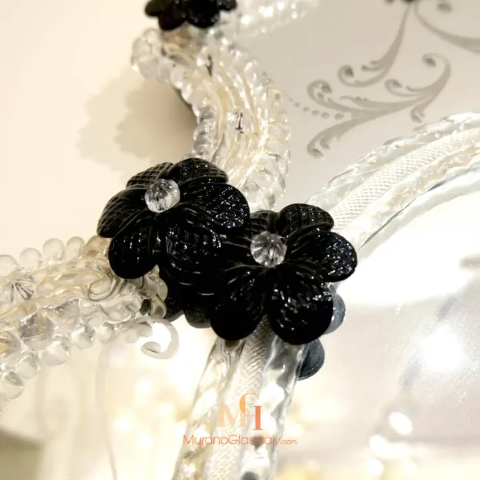Dieser exquisite Spiegel fasziniert mit seinen filigranen handgravierten Mustern und den markanten schwarzen Murano-Glasblumen. Die kunstvollen klaren Glaselemente verstärken seine strahlende Präsenz, während die tiefschwarzen Blumen einen eleganten Kontrast schaffen, der eine Aura von Geheimnis und Raffinesse ausstrahlt. Sein skulpturales Design macht ihn zum perfekten Blickfang für ein stilvolles Wohnzimmer, einen luxuriösen Eingangsbereich oder ein elegantes Schlafzimmer. Er fügt sich mühelos in klassische und moderne Interieurs ein.