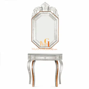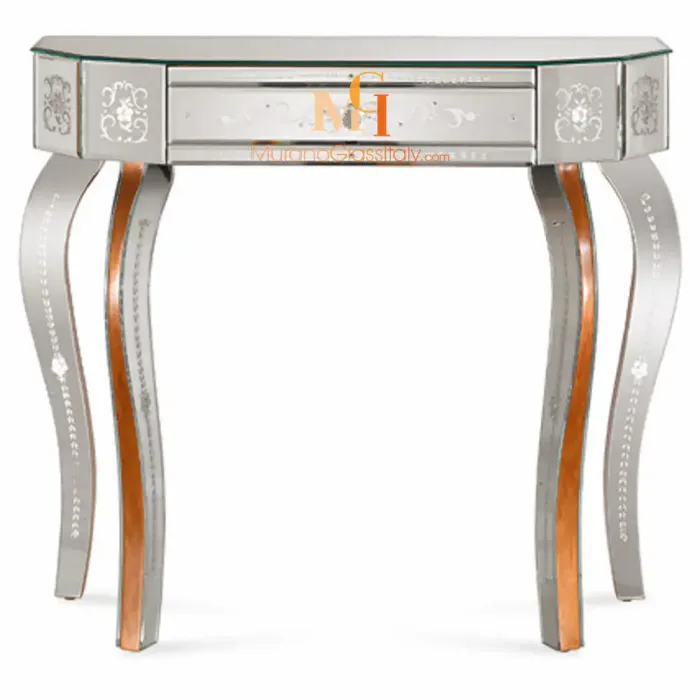 Verliebe dich in pure Eleganz mit der Spiegelkonsole mit Schubladen und hole dir den zeitlosen Zauber Venedigs in dein Zuhause. Dieses Meisterwerk ist mehr als ein Möbelstück – es ist eine handgefertigte Skulptur, geschaffen im Herzen Venedigs von unseren MuranoGlassItaly-Künstlern.