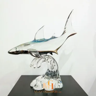 Glashai bringt die majestätische Schönheit des Ozeans direkt in Ihr Zuhause. Handgefertigt in Venedig von unseren Meisterhandwerkern bei MuranoGlassItaly, fängt diese beeindruckende Skulptur die Kraft, Eleganz und Mystik des Hais ein. Die schlanken Linien und die dynamische Bewegung vermitteln Freiheit und Stärke und ziehen Sie in die Tiefen des Meeres.