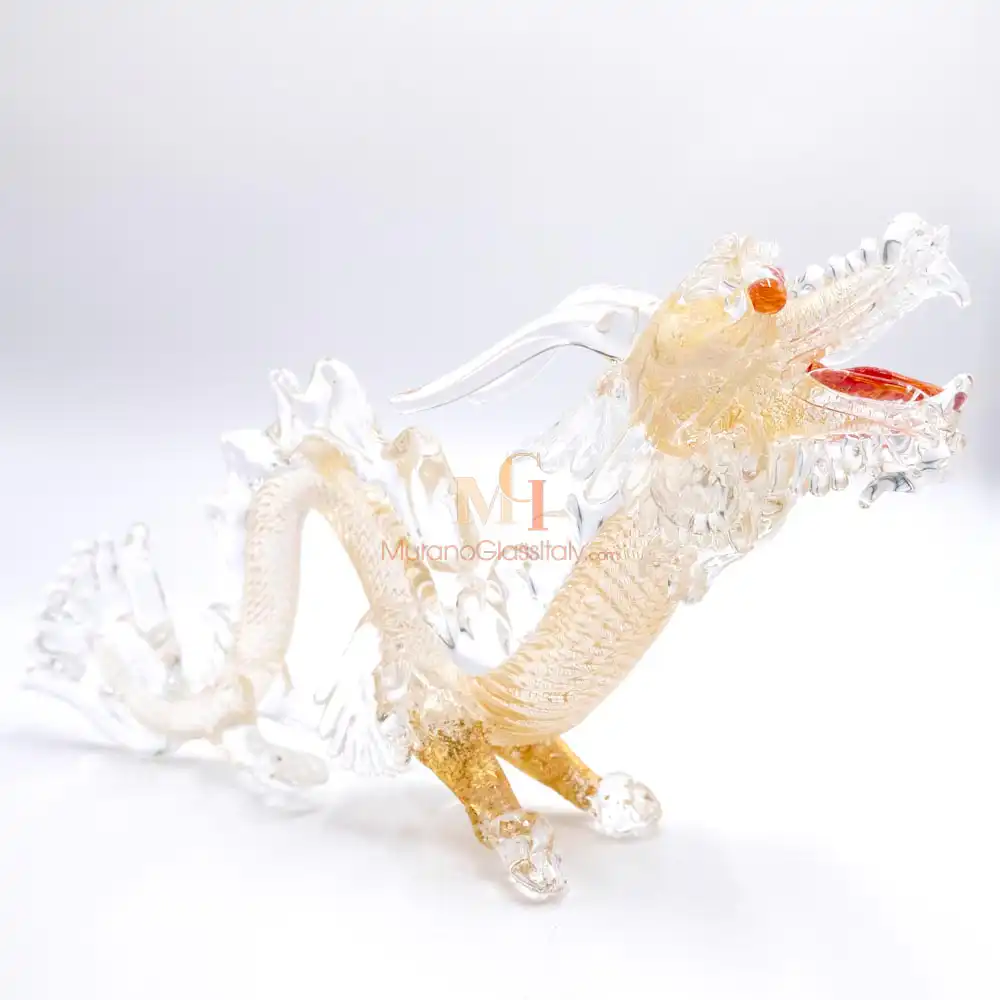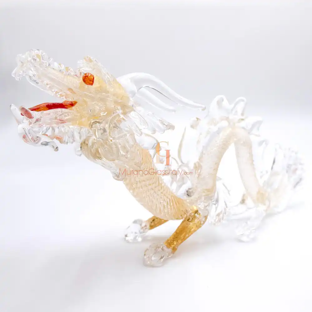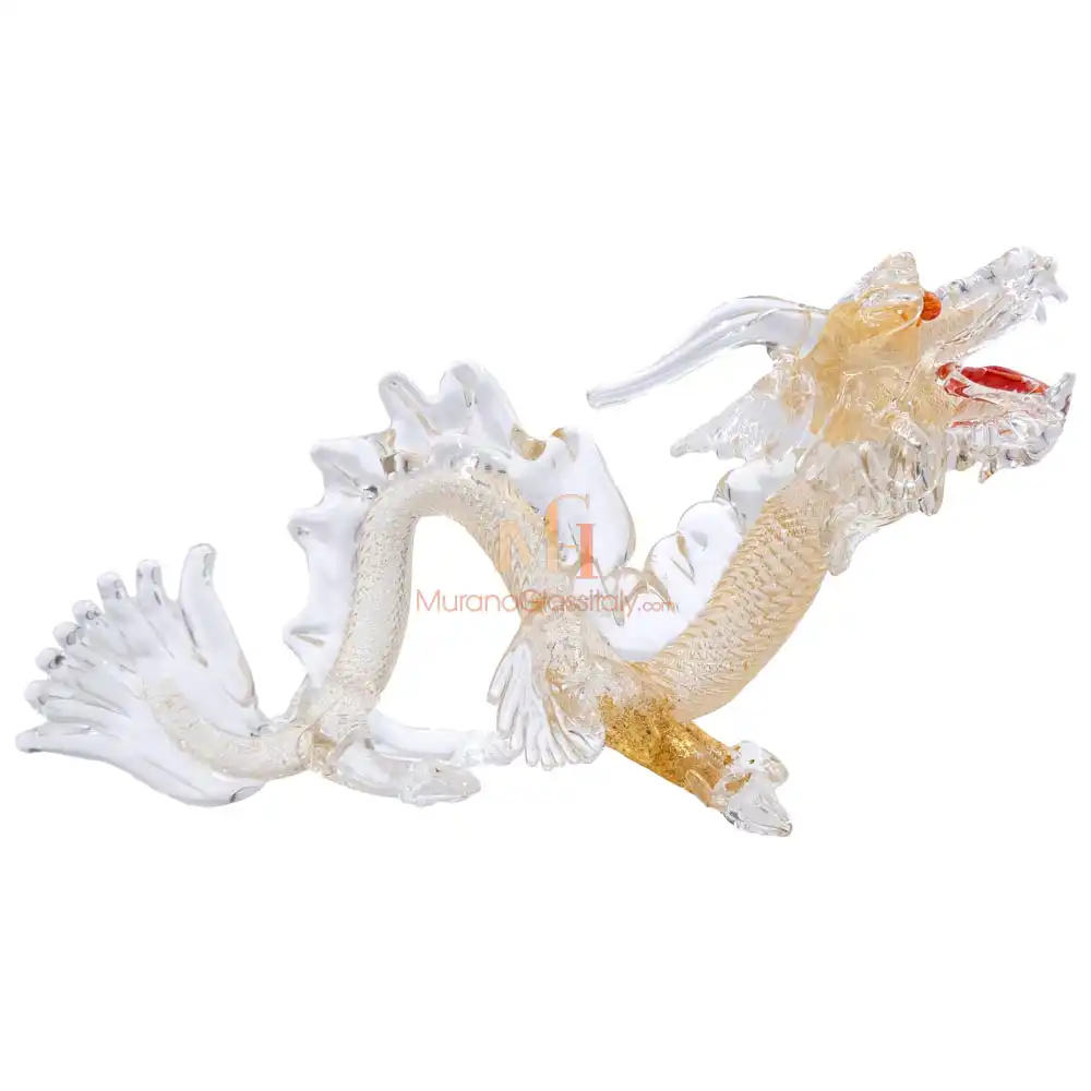 Erleben Sie die majestätische Anziehungskraft unseres Glas Drache, ein atemberaubendes Zeugnis der venezianischen Glaskunst. Von unseren MuranoGlassItaly-Kunsthandwerkern mit Leidenschaft und Präzision gefertigt strahlt dieser Drache eine Aura des Wunders und der Mystik aus. Der Drache repräsentiert Kraft, Stärke und Weisheit und besitzt weltweit tiefe kulturelle Bedeutung. Er symbolisiert Schutz, Glück und Transformation. In dieser Skulptur verkörpert er diese zeitlosen Qualitäten und erinnert täglich an innere Stärke, Mut und Ehrgeiz. Er inspiriert Träume zu verfolgen und sich persönlich weiterzuentwickeln.