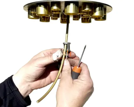 Finalmente, conecte el cable de tierra amarillo del marco de la lámpara de araña al terminal de tierra dedicado utilizando el tornillo o bloque de terminales proporcionado. Las prácticas de cableado seguro son fundamentales para el montaje e instalación de la lámpara de araña.