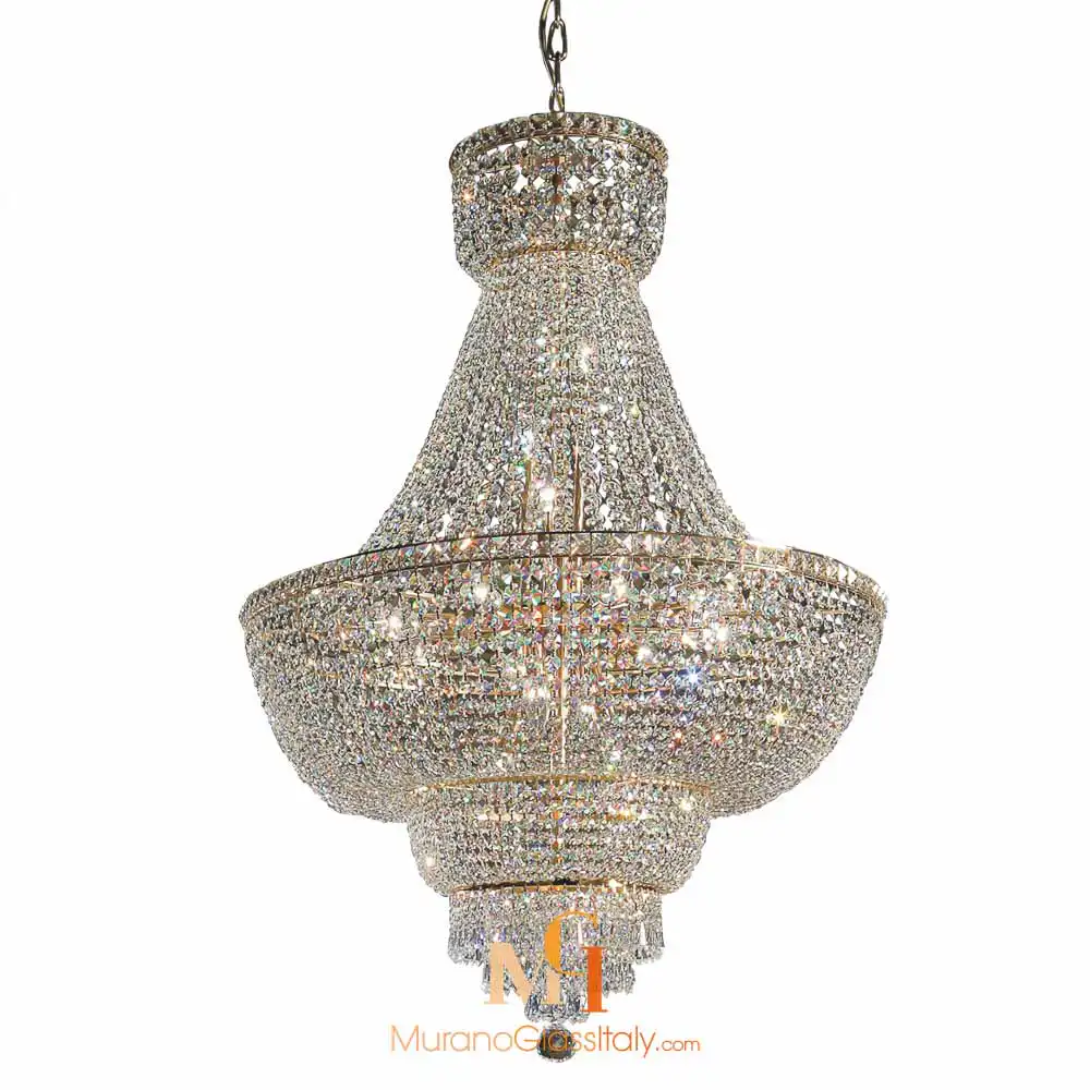 Nuestra colección de arañas de cristal de gran tamaño está pensada para quienes no buscan una iluminación sencilla, sino una obra de arte capaz de asombrar. Con la araña Beethoven hemos creado una de las arañas de cristal más refinadas, que no sólo ilumina, sino que embellece cualquier interior. Esta impresionante araña está hecha a mano por nuestros artesanos y ricamente decorada con cristales de la más alta calidad. Con sus 110 cm de altura y sus 15 luces, la lámpara Beethoven no se limita a iluminar, sino que representa un lujoso complemento de decoración y diseño. Elija el diseño Made in Italy y haga brillar su hogar con una obra de arte única de nuestra colección de arañas de cristal de gran tamaño. Como artesanos, en MuranoGlassItaly no sólo creamos todas nuestras obras de arte 100% a mano, sino que también podemos personalizar las arañas de acuerdo a sus preferencias. Por lo tanto, si desea tener esta extraordinaria obra maestra pero necesita ajustar el tamaño o el número de luces, crearemos una lámpara de araña que se adapte a sus espacios. Para más información, no dude en ponerse en contacto con nosotros. Nuestros expertos estarán encantados de ayudarle y asesorarle. Escríbanos un correo electrónico a customer@muranoglassitaly.com