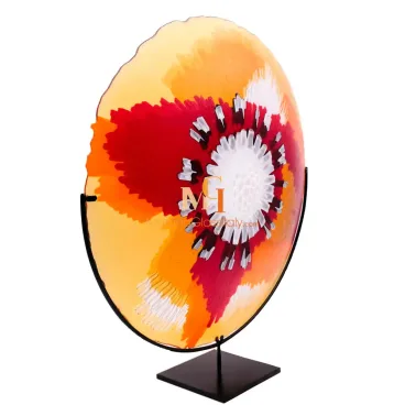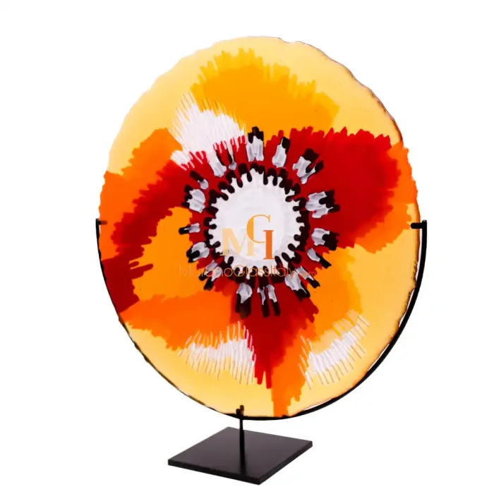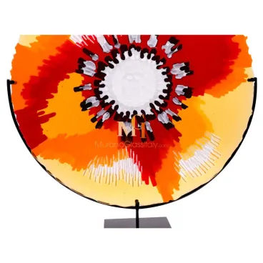 Nuestros Grandes Platos Decorativos de Vidrio son hermosas obras de arte decorativas, que traen los colores y la belleza de Venecia directamente a su salón, cocina u oficina. Dentro de la colección, el plato Flor del Tesoro presenta vibrantes colores rojo y naranja que crean un brillante contraste. El encantador diseño floral evoca la Gazania o Flor del Tesoro: un símbolo de buena fortuna, riqueza y opulencia. Una flor que alegrará el más aburrido de los días, al igual que esta espléndida obra de arte. El plato tiene una altura de 53 cm y un diámetro de 50 cm. Gracias a su base metálica, puede colocarse fácilmente en una estantería, consola o escritorio, donde añadirá un toque de color al espacio circundante. La obra está totalmente creada a mano en los hornos venecianos por nuestros maestros vidrieros. Está pensada para los amantes del arte y para aquellos que quieran llevarse consigo algo de la magia de Venecia. Todos los Grandes Platos Decorativos de Vidrio son creaciones únicas y exclusivas provistas siempre de un certificado de autenticidad que demuestra que la obra de arte ha sido realizada en Venecia, Italia.