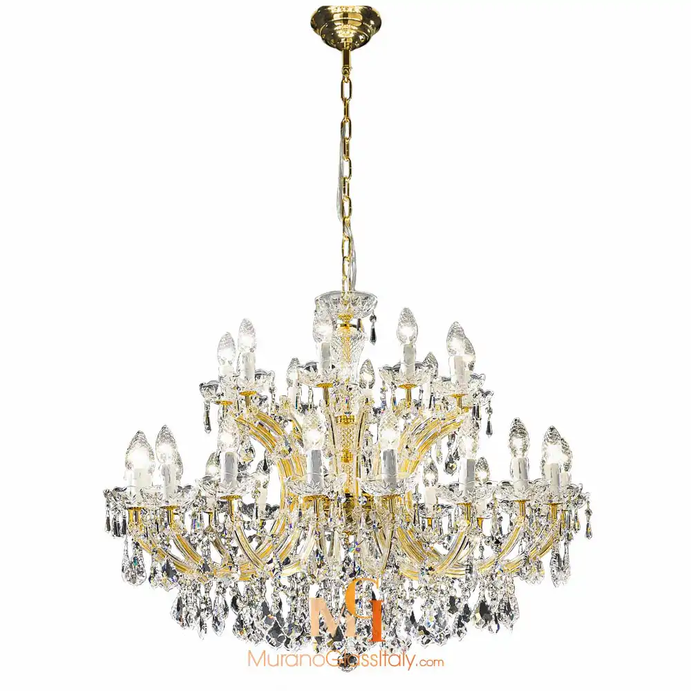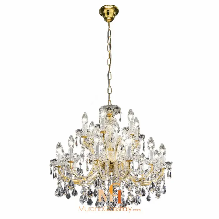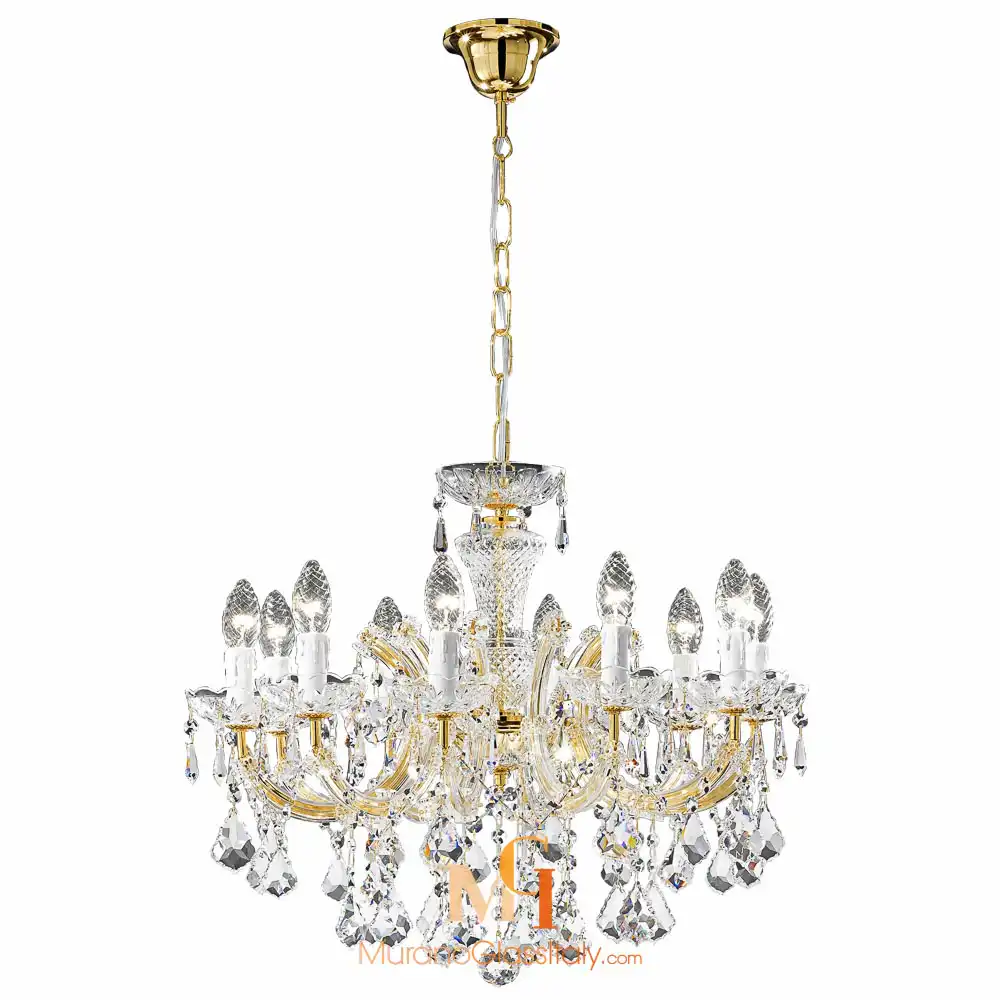 Esta tradicional araña de cristal está diseñada para realzar la belleza y el atractivo de cualquier interior. Totalmente creada a mano por nuestros mejores artesanos venecianos, la araña Lienz presenta un diseño sencillo realzado con una cascada de adornos de cristal. Los colgantes de cristal reflejan la luz maravillosamente, creando impresionantes reflejos incluso cuando la araña está apagada, iluminada únicamente por la luz natural. La combinación de los colores dorado y cristal da a la obra un aspecto noble que hace de esta Araña de Cristal Tradicional una verdadera joya artística. Todos los detalles artesanales acentúan la singularidad y elegancia de esta impresionante pieza. La lámpara de araña puede elegirse en diferentes tamaños. Además, como artesanos, no sólo creamos todas nuestras obras de arte 100% a mano, sino que también podemos personalizar las lámparas de araña según sus preferencias. Así, si desea tener esta impresionante obra maestra pero necesita ajustar el tamaño o el número de luces, crearemos una lámpara de araña que se adapte a sus espacios. Para más información, no dude en ponerse en contacto con nosotros. Nuestros expertos estarán encantados de ayudarle y asesorarle. Escríbanos un correo electrónico a customer@muranoglassitaly.com