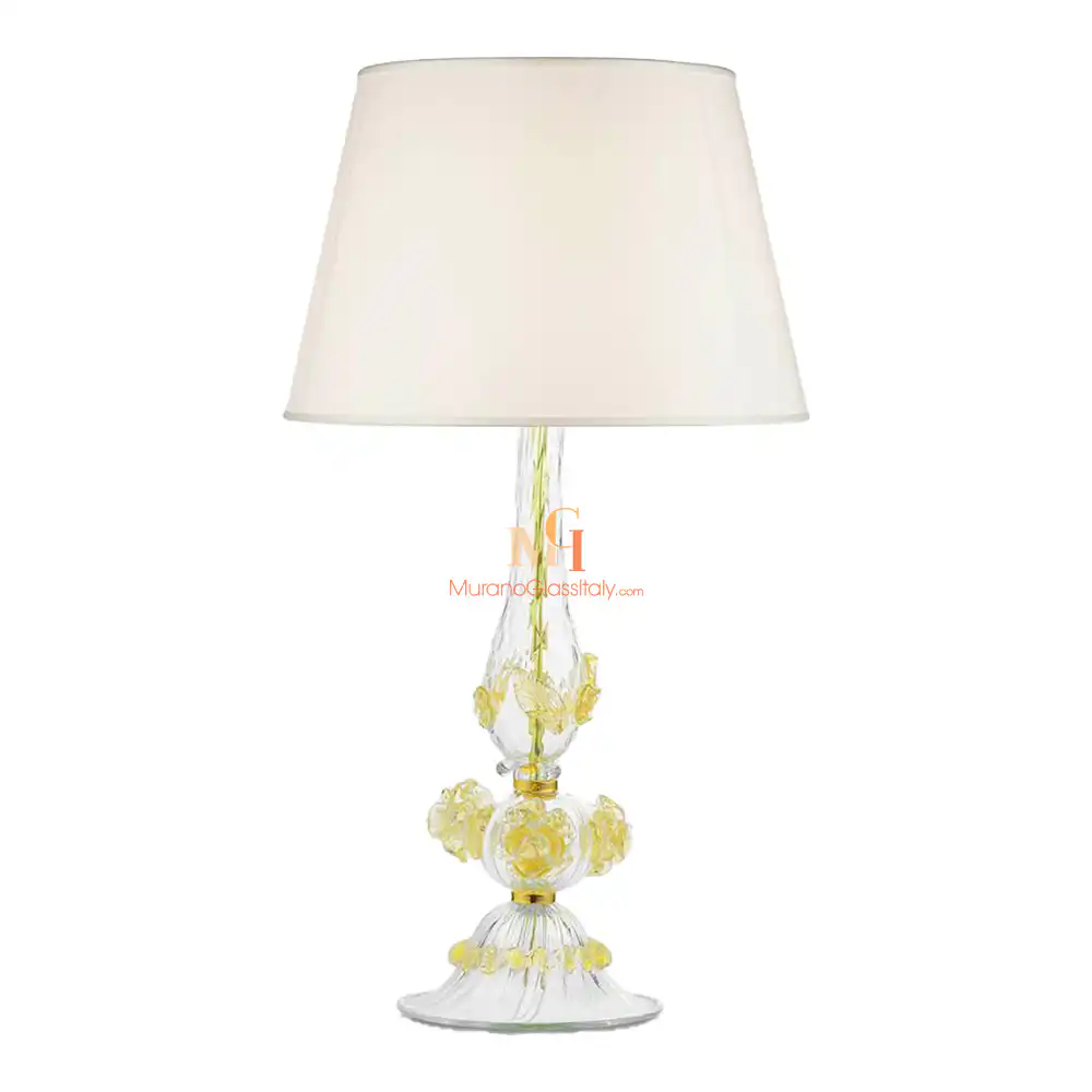 Sa silhouette élégante et sophistiquée repose sur un pied en verre soufflé, orné de détails floraux délicats et de torsades douces. Son corps sculptural s’élève avec légèreté, surmonté d’un abat-jour en tissu minimaliste qui diffuse une lumière chaleureuse et accueillante. Fulvia allie le raffinement vénitien à une touche contemporaine, créant un point focal remarquable dans tout type de décor.