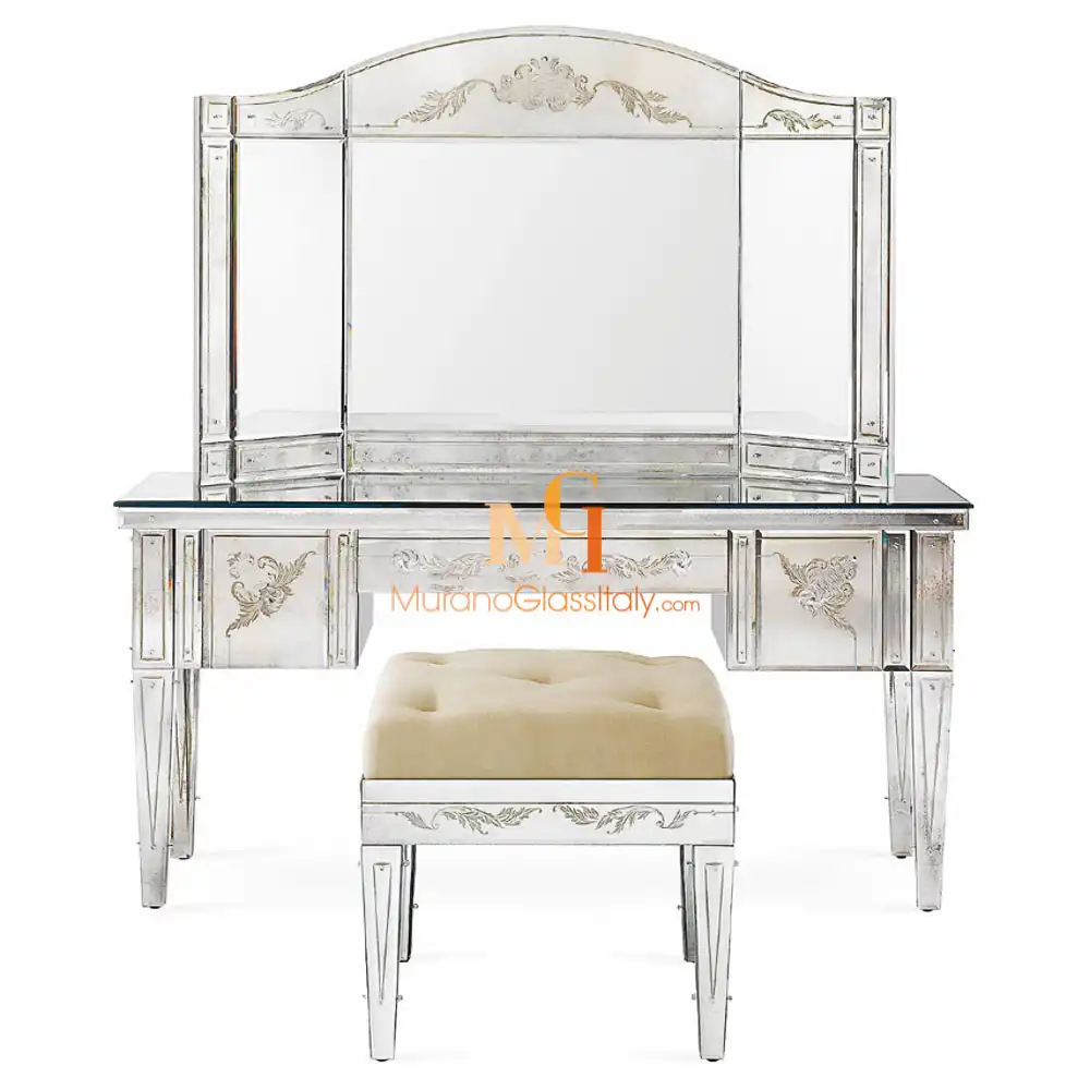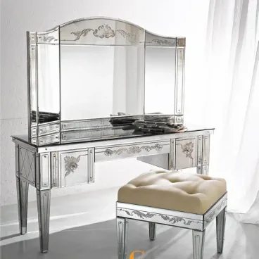 La surface miroir reflète plus que ton image. Elle reflète ton âme. Chaque détail émeut. Les gravures délicates et les courbes sculptées capturent la poésie de l’art vénitien. Imagine-la dans ta chambre ou ton espace beauté. Elle y ajoute une touche de charme noble et de douceur. Ce n’est pas une simple coiffeuse. C’est un coin sacré où naissent les rêves et où la beauté se vit.