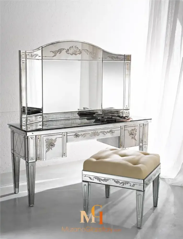 Transforme ton espace en un sanctuaire intemporel avec la Coiffeuse De Luxe et laisse ton cœur succomber à l’élégance. Cette pièce onirique réveille la beauté de chaque rituel du matin. Nos artisans de MuranoGlassItaly la façonnent à la main, au cœur de Venise. Elle raconte une histoire de grâce, de tradition et de passion transmise depuis des générations.