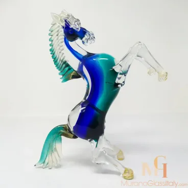 Cette magnifique Figurine Cheval Murano en cristal vert de Murano est ornée de délicats détails en or 24 carats. Admirez l’élégance et l’attention particulière portée aux détails en or et en cristal parfaitement disposés sur cette sculpture sauvage. Cette création représente la royauté, le luxe et le glamour. C’est un chef-d’œuvre aux détails poétiques, qui ont le pouvoir non seulement de créer une ambiance chaleureuse, mais aussi de vous faire vivre des émotions passionnées. Cette œuvre remonte à une tradition millénaire du soufflage de verre de Murano, réalisée à Venise, en Italie.