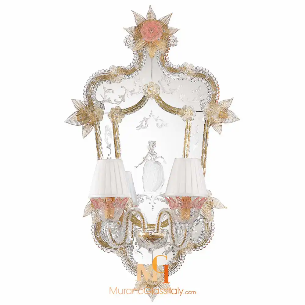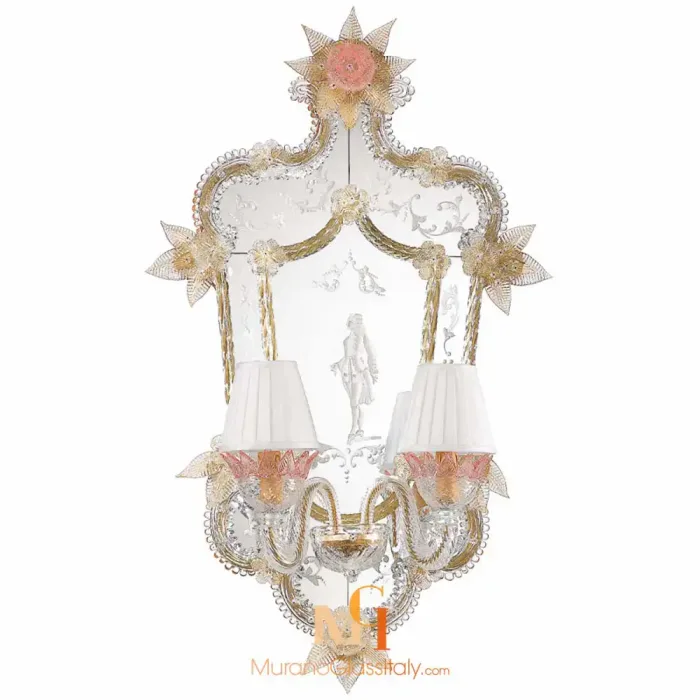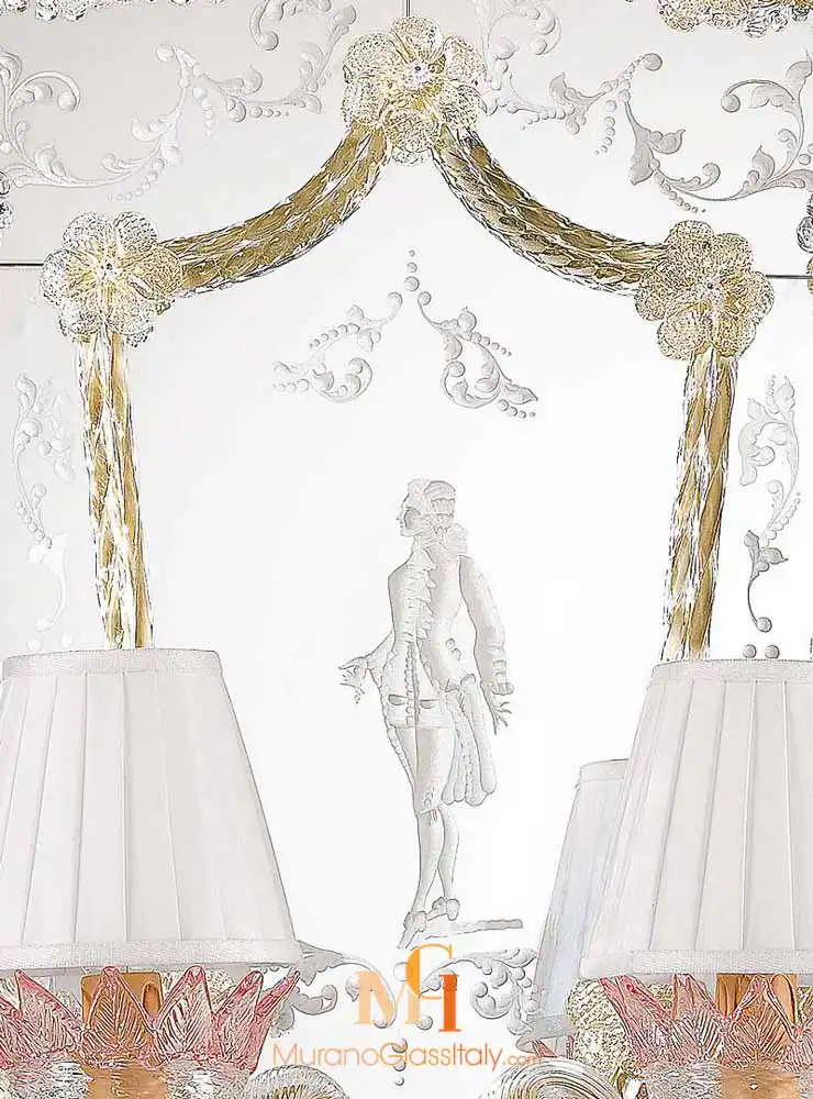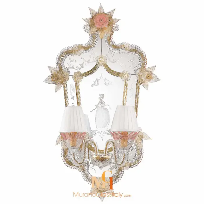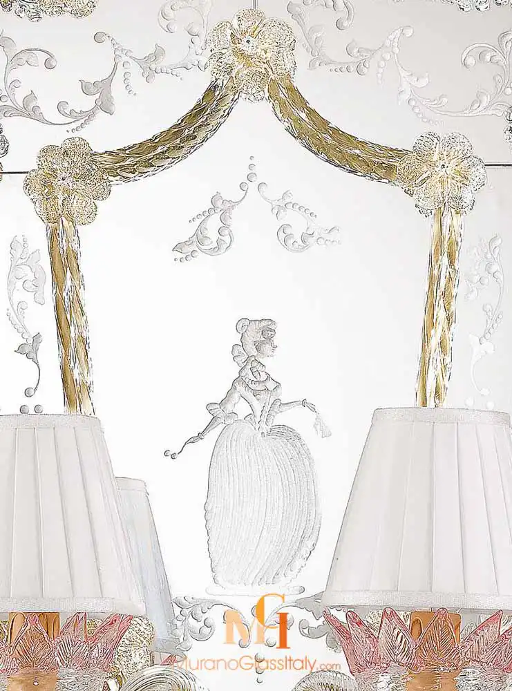 Le Miroir Casanova, nommé en hommage au célèbre charmeur vénitien Casanova, incarne le romantisme et le luxe. Son cadre en bois délicat est orné de décorations en verre de Murano infusées d’or 24 carats. Les motifs floraux et les accents dorés captent la lumière, créant un éclat radieux qui attire le regard. Chaque détail du miroir Casanova raconte une histoire de grâce et de beauté intemporelle.