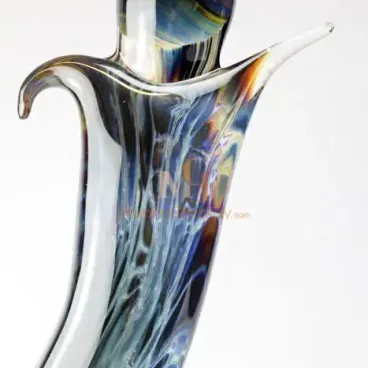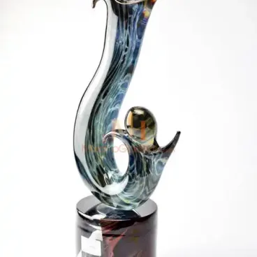 La sculpture s’inspire de la beauté dynamique du mouvement. Ses lignes fluides et ses courbes harmonieuses rappellent deux danseurs en parfaite synchronisation. Fabriquée en chalcedoine, elle reflète le savoir-faire unique des artisans de Murano. Ils mélangent habilement la silice avec des minéraux précieux pour créer des teintes captivantes. Des bleus profonds, des ors scintillants et des verts vibrants s’entrelacent en motifs hypnotiques. Chaque pièce est unique, car les couleurs se mêlent de façon imprévisible.