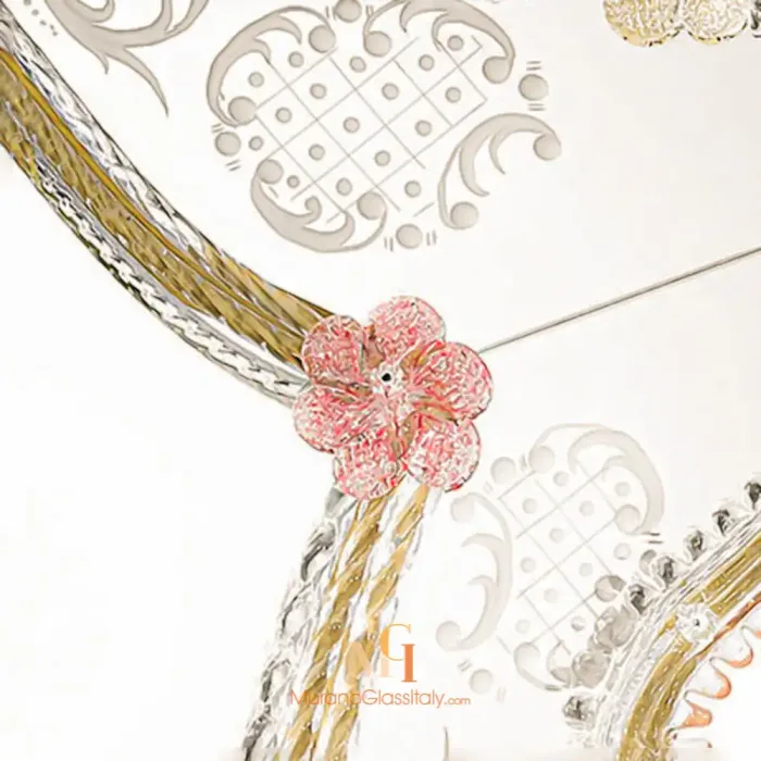 The Perugia mirror captivates with its delicate artistry. Its engraved glass features intricate floral motifs, handcrafted with precision. Adorned with 24-karat gold decorations, it sparkles with sophistication. The natural wood structure adds warmth and stability, complementing the luxurious glasswork. Soft pink and golden accents enhance its romantic charm, evoking the beauty of Perugia, a city renowned for its art and culture.