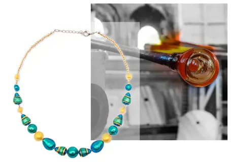 コレクションには、鮮やかなステートメントネックレスから、上品なピアス・イヤリング、ブレスレット、ペンダントまで多彩なライン。吹きガラスで成形し、金箔・銀箔、精緻なミルフィオーリ模様などで仕上げます。軽やかで丈夫、ギフトにも最適です。