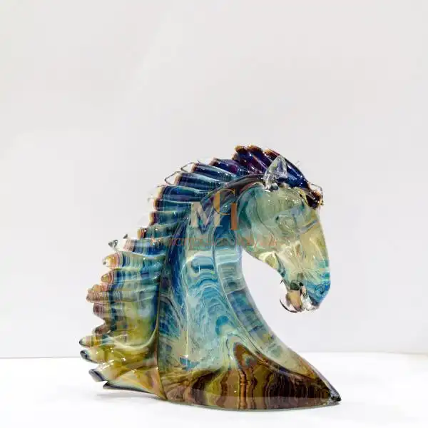 希少なカルセドニー・ガラスで作られたムラーノ・ホースは、鮮やかな色彩を放つ。作家は錬金術師のように、シリカと貴重な鉱物を混ぜ合わせ、青、暖かみのある琥珀色、土の色など、渦巻くような色合いを生み出している。カルセドニー・ガラスが再現不可能なパターンと色の組み合わせを形成するため、同じ彫刻は2つとない。