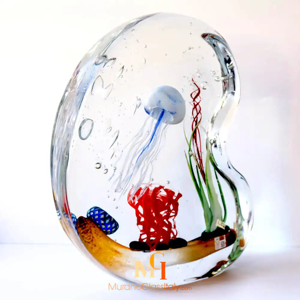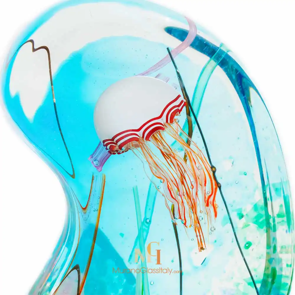 Experience the mystery and beauty of the deep blue sea with our Jellyfish Glass Sculpture made in Italy. Crafted with precision and passion, the displayed aquarium is a true masterpiece that captures the magnificence of the amazing underwater world. Jellyfish are known for their tranquility, grace, and resilience, and this delicate creature captures these qualities perfectly. Rose seems to swim effortlessly across the water as if dancing.