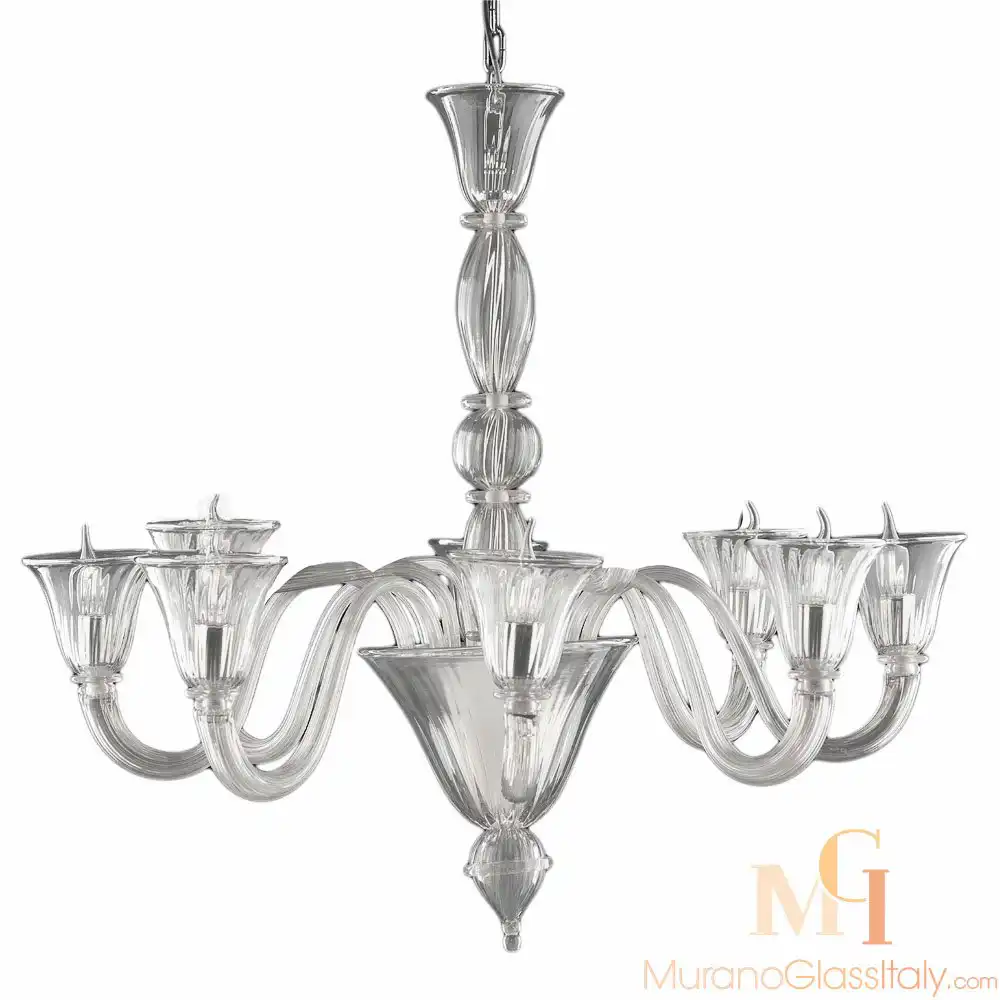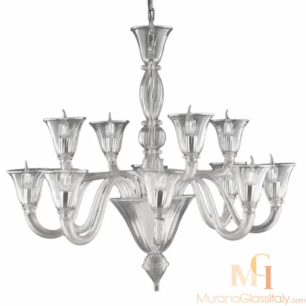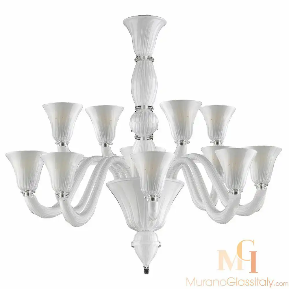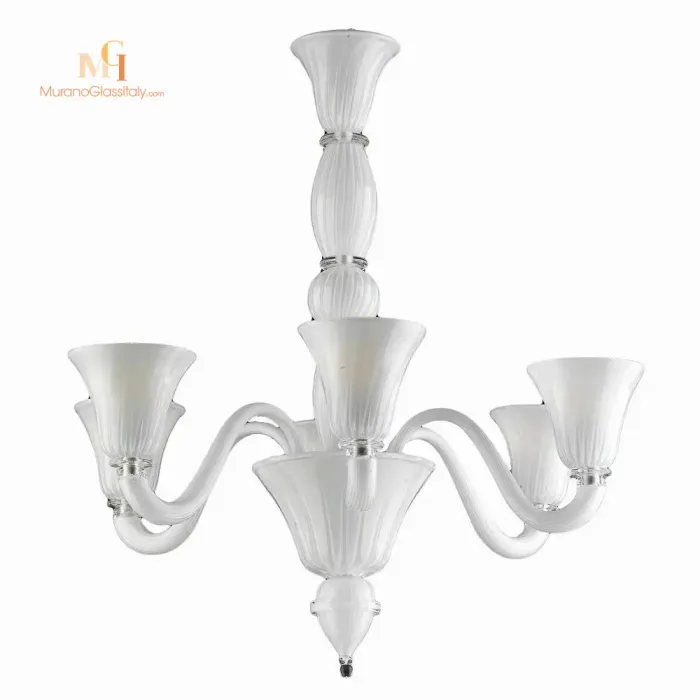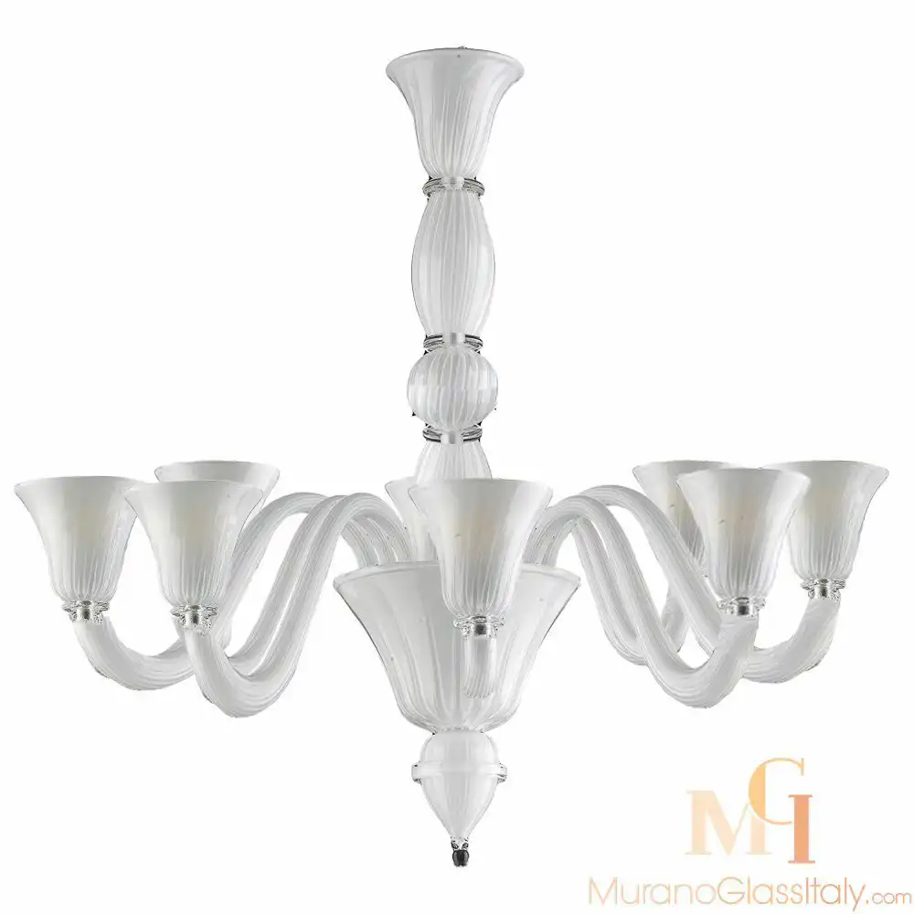 Украсьте свой дом этой потрясающей белой люстрой из Мурано и добавьте в него нотку сияния. Позвольте этой изысканной люстре стать музой для Вашего интерьера. Высокий уровень мастерства, внимание к деталям и неподвластная времени элегантность делают этот уникальный шедевр прекрасным дополнением к любому домашнему декору. Эта люстра изготовлена в соответствии с 1000-летней традицией производства стекла на острове Мурано, Италия. Люстра может быть изготовлена на заказ в различных вариантах освещения и цветов, для получения дополнительной информации свяжитесь с нами по адресу customer@muranoglassitaly.com.
